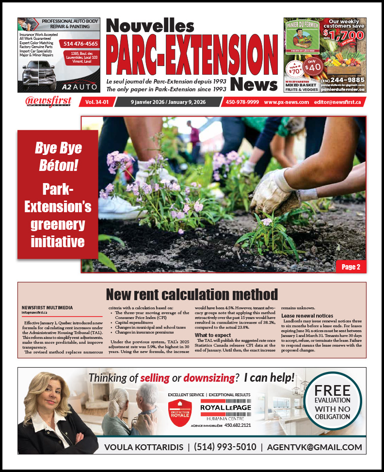 ArchivesParc-Extension News 34-01Par Parc-Ex News Staff - January 9, 2026FacebookTwitterPinterestWhatsAppLinkedinEmail The current issue of the Parc-Extension News published January 9th, 2026.Covering Parc-Extension’s local news, politics, sports and other newsworthy events.